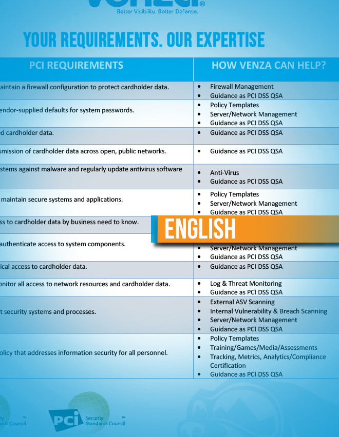 Let VENZA be your guide to PCI DSS Compliance by meeting all 12 of these requirements set forth by the PCI Security Standards Council.