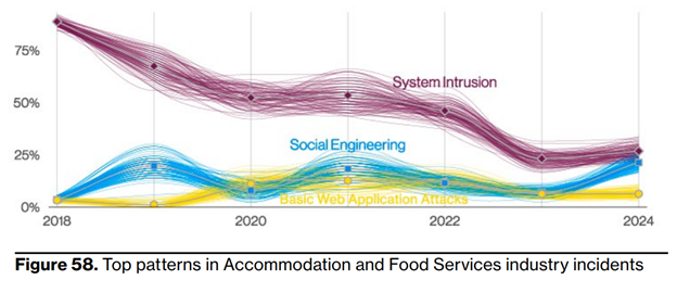 Now, recent data shows social engineering accounts for 25% of incidents in hospitality, with pretexting doubling over the past year to make up 20% of cases.
